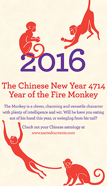 As the Monkey is known for being clever, intelligent and resourceful, it should be a year of new innovation and invention. The Monkey is a problem solver but he can also create them. This is a time of risk taking and there is the potential of sudden changes of all kinds (don’t try to keep a Monkey down). It is important to keep your sense of humor in the year of the unpredictable Monkey.